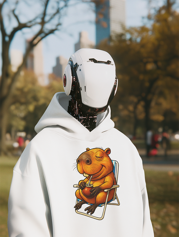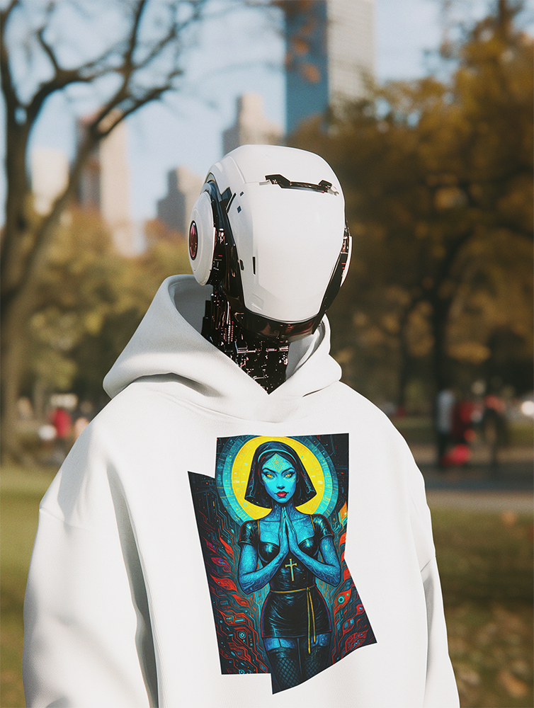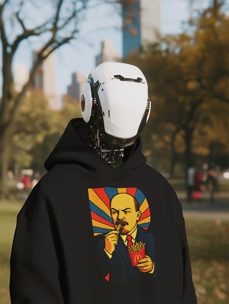 Размерът на щампата е един и същ за всички размери суичери, което означава, че при S визуално изглежда по-голяма, а при XL – по-малка.